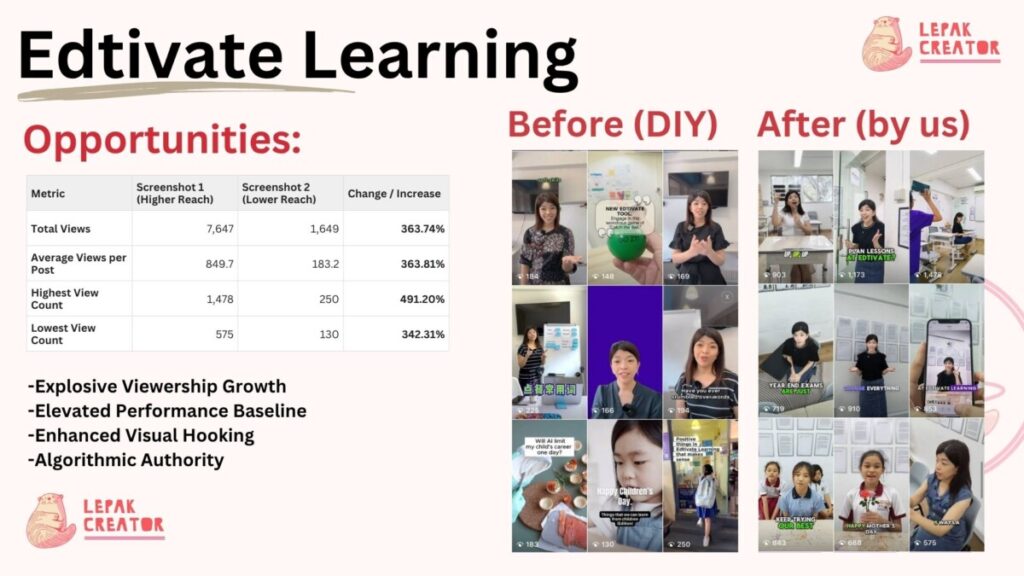 To work on hyper-competitive industry such as Education, we need to build momentum through engineer strategy. By pivoting Edtivate Learning away from standard DIY recordings toward our “Visual Hooking” strategy, we didn’t just find an audience—we dominated the feed with a 363.74% increase in total viewership.
